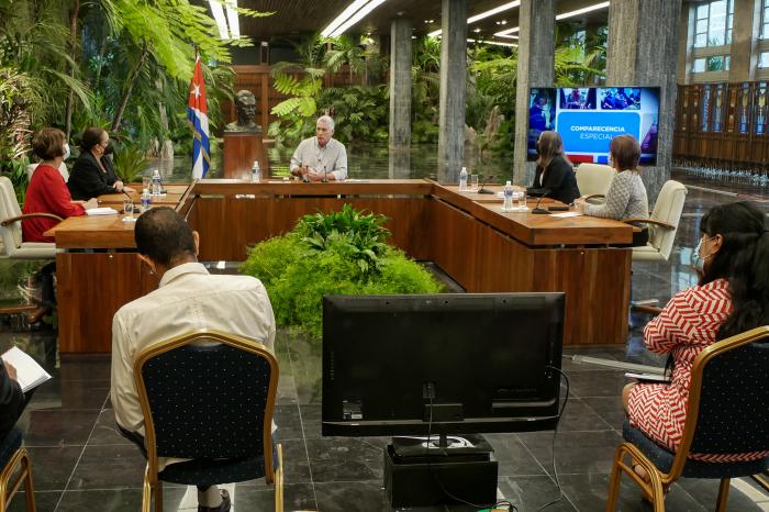A las 8:30 p.m. de este viernes, los canales de televisión cubanos transmitieron las respuestas del Primer Secretario del Comité Central del Partido Comunista de Cuba y Presidente de la República, Miguel Díaz-Canel Bermúdez, a un grupo de periodistas nacionales.