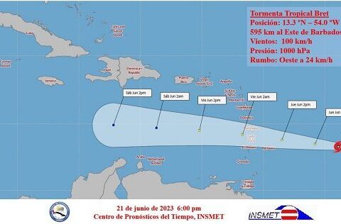 La tormenta tropical Bret ganó algo más en intensidad y a las cinco de la tarde del miércoles sus vientos máximos sostenidos alcanzaron los 100 kilómetros por hora, superiores en rachas