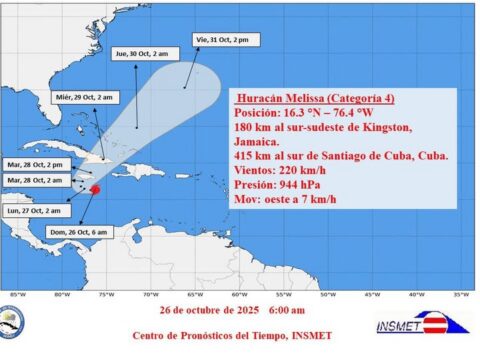 El huracán Melissa se ha mantenido con igual intensidad y va lentamente al norte-nordeste.